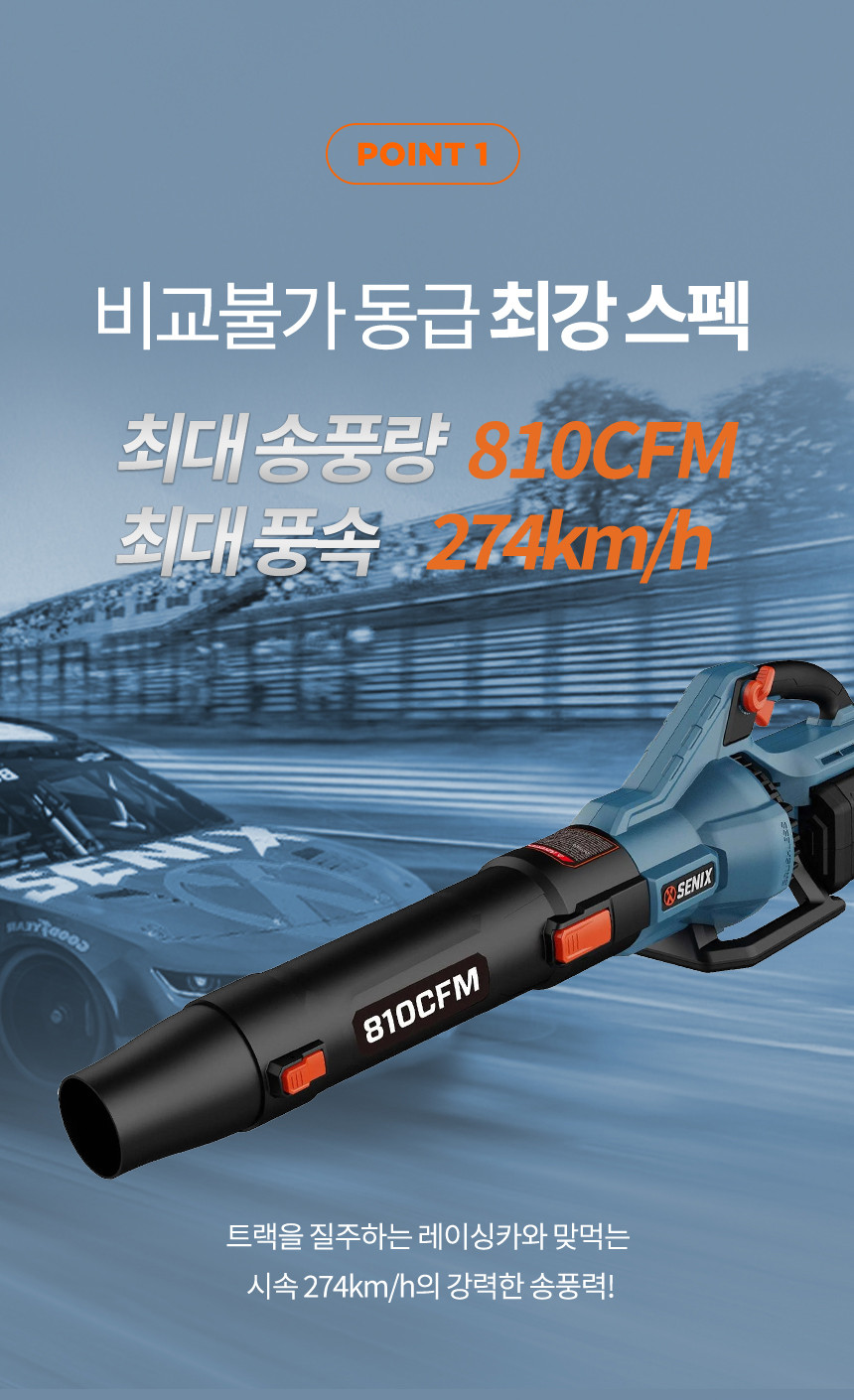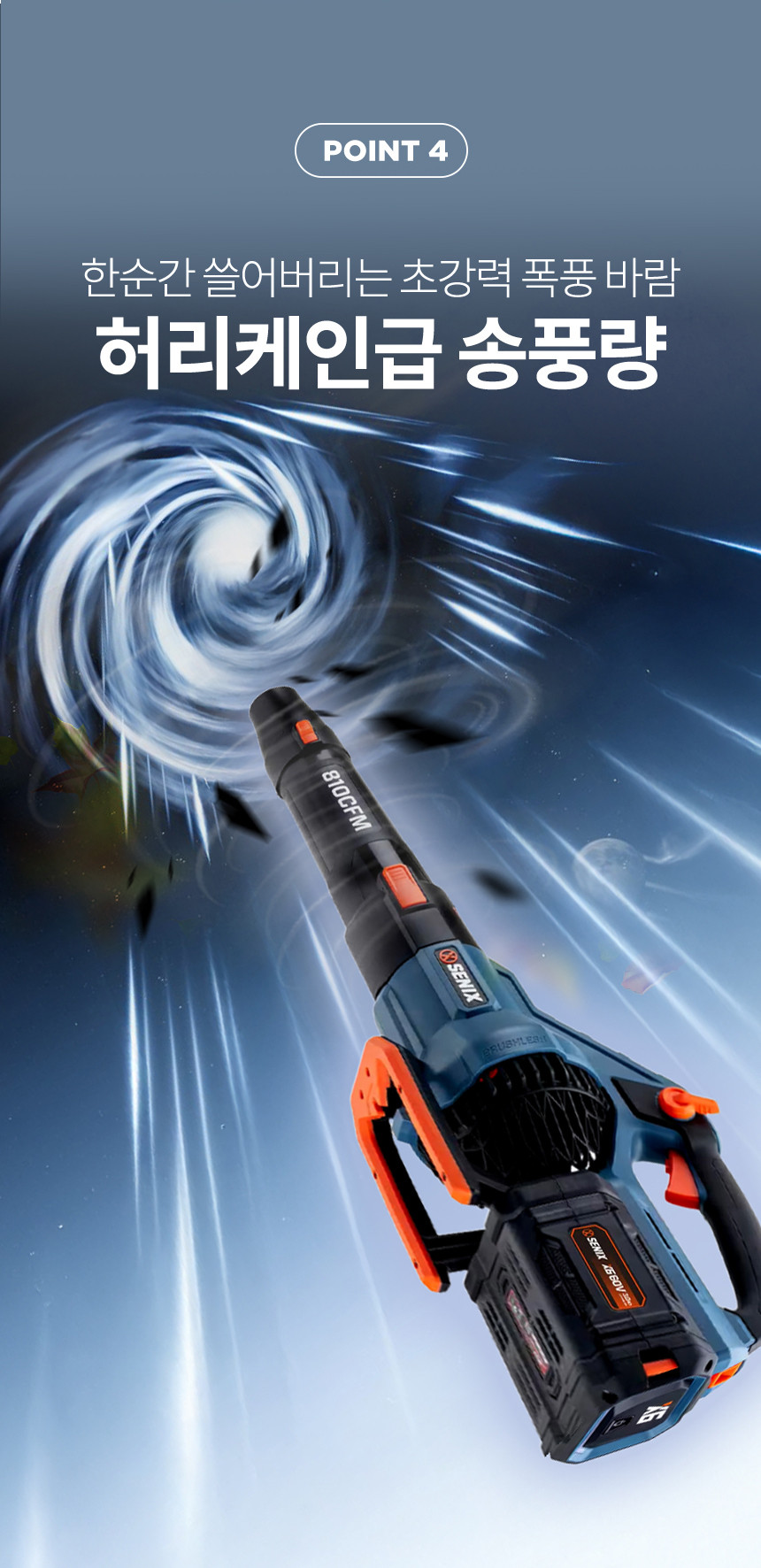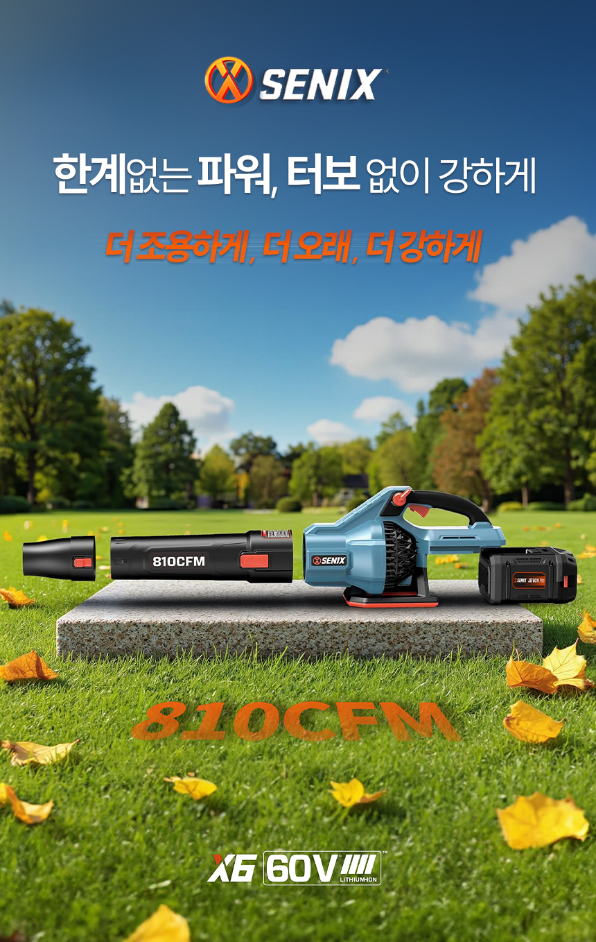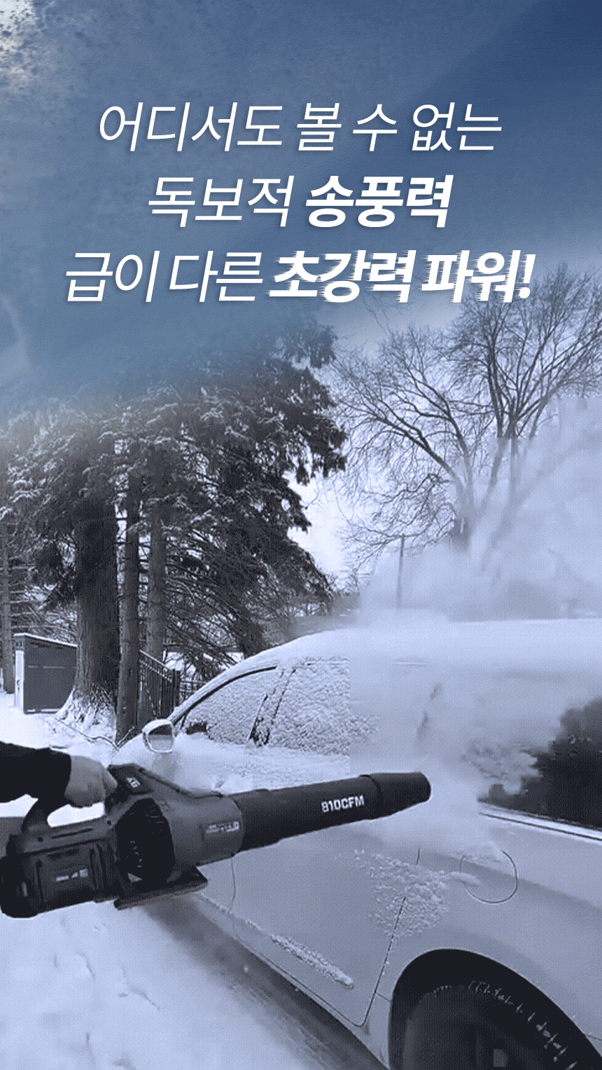 또한 고성능 60V 브러시리스 모터가 장착되어 강력한 810CFM의 파워로 무겁고 큰 이물질들도 문제 없이 치워낼 수 있습니다.