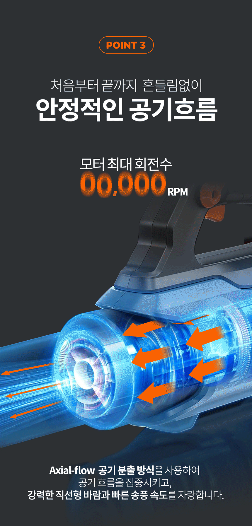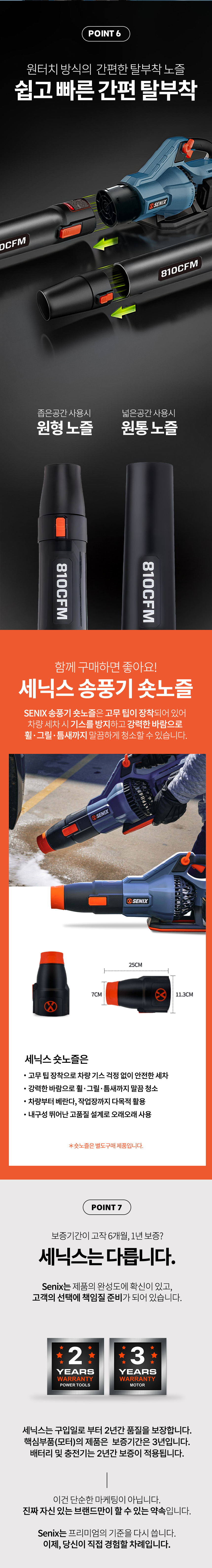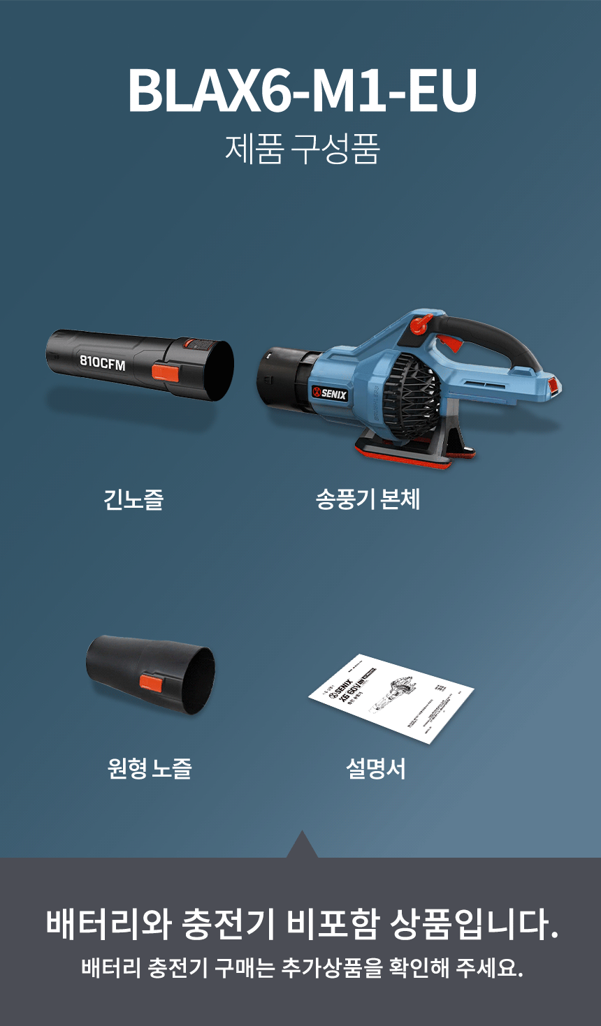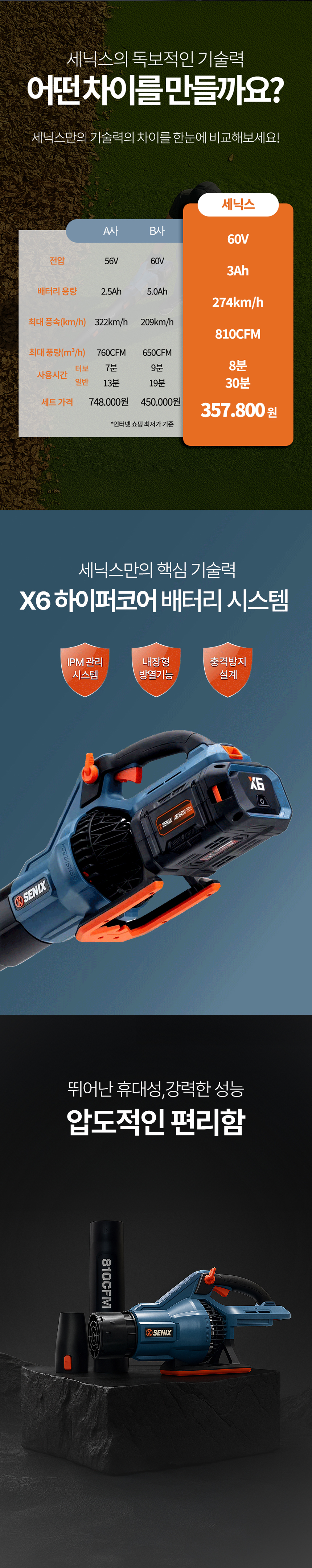 또한 고성능 60V 브러시리스 모터가 장착되어 강력한 810CFM의 파워로 무겁고 큰 이물질들도 문제 없이 치워낼 수 있습니다.