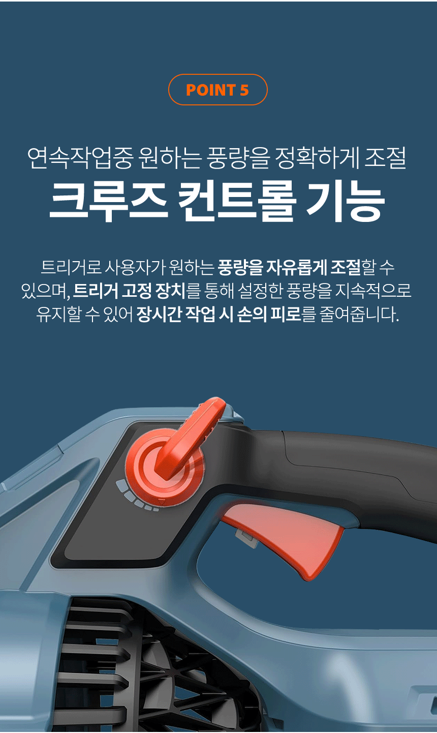 터보 버튼이 별도로 없어 최대 파워 사용이 번거롭지 않으며 트리거 버튼과 크루즈 컨트롤 버튼을 통합하여 크루즈 모드 설정 및 해제를 편안하고 쉽게 사용이 가능한 제품입니다.